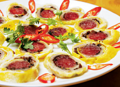 – Xếp trứng cuộn pa-tê, lạp xưởng lên đĩa.